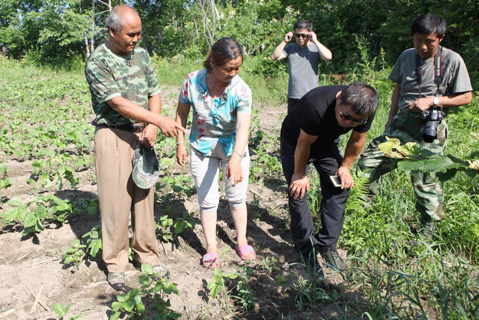 早上6点,县林业局工作人员前往发现东北虎足迹现场,据蜂农纪春英介绍他们夫妻二人到附近的河边去取水,返回途中发现农田边有一排非常清晰的动物足迹,看起来像猫科动物,由于听说过前阶段我县有东北虎经过,从爪印看确实很像,随即将情况及时上报县林业局。