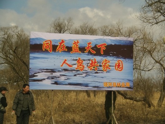 行动期间,饶河县森林公安局出动警力9次2 6人,共清除粘网4片,支架3副。发放宣传单500张,在饶河岛设立永久宣传牌1处。